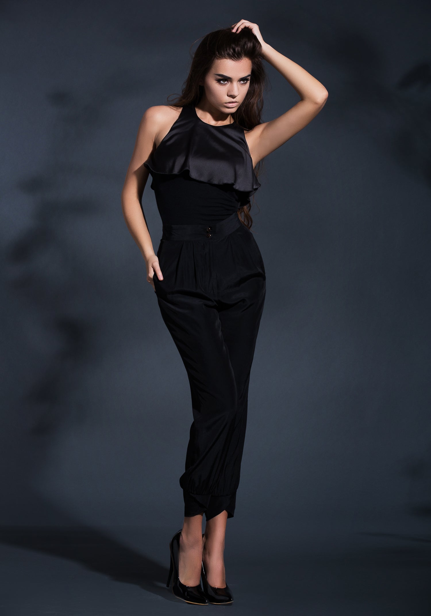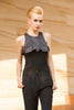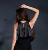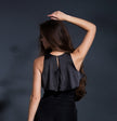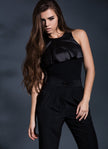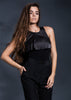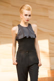 One piece tank top with top layer cropped satin fabric and bottom layer stretchable rib knit; top layer is dark grey/ lead colour whereas bottom layer is black; hook-and-eye closure at back.