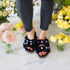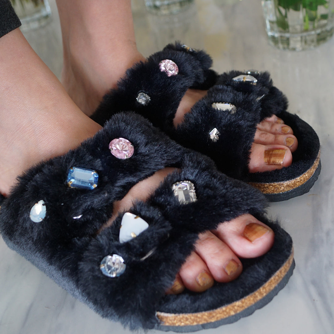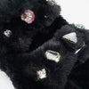 Shearling Fur Slide With Rhinestones - Black Flat Women's Sandals