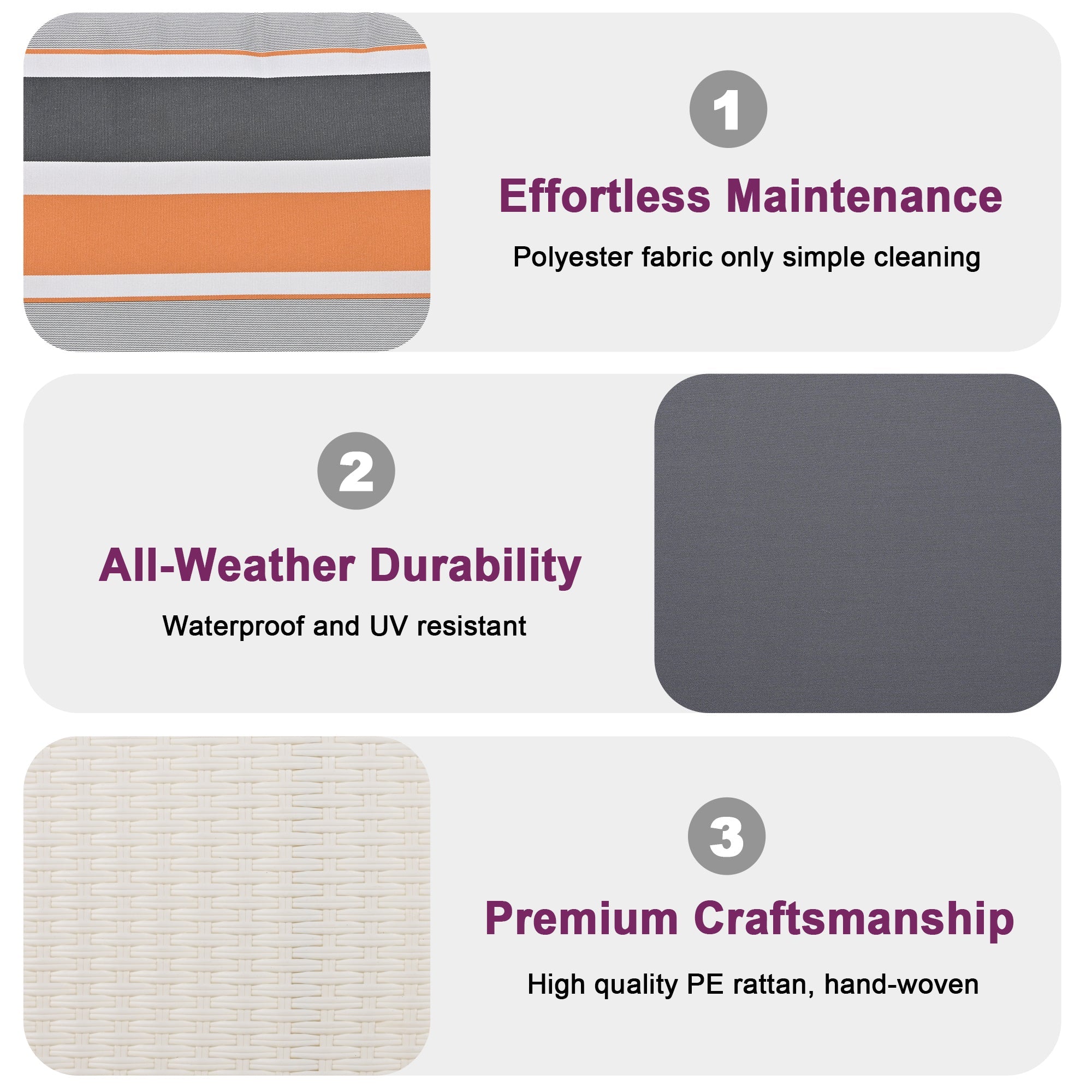 Built for the great outdoors, our all-weather porch swing is designed to withstand various environmental conditions. The PE rattan material resists the elements, ensuring that your swing remains vibrant and intact no matter what weather comes its way. The water-repellent polyester cushion covers provide protection from the rain, keeping your seating area dry and comfortable.