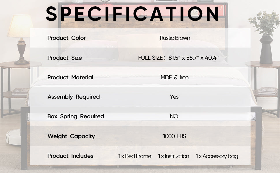 Introducing the Smart RGB LED Bed Frame – the ultimate upgrade for your bedroom! This full-size bed frame features a color-changing LED headboard, built-in storage, and a fast-charging station for maximum convenience. The industrial rustic design, with wood and metal accents, adds a modern yet cozy touch to your space. The LED headboard offers over 60,000 color options and can be controlled via remote or mobile app for a customizable ambiance. The built-in storage shelf includes 20W fast-charging ports and provides space for essentials like books, phones, and decor. No box spring is needed thanks to the sturdy metal slats that provide strong mattress support. Don't miss out on this limited stock item – bring high-tech comfort to your bedroom today!