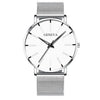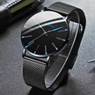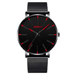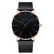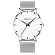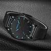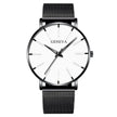Designed in Geneva, this watch features a striking black dial adorned with minimalist markers and sleek hands while the sophisticated mesh strap adds a contemporary edge to any outfit.