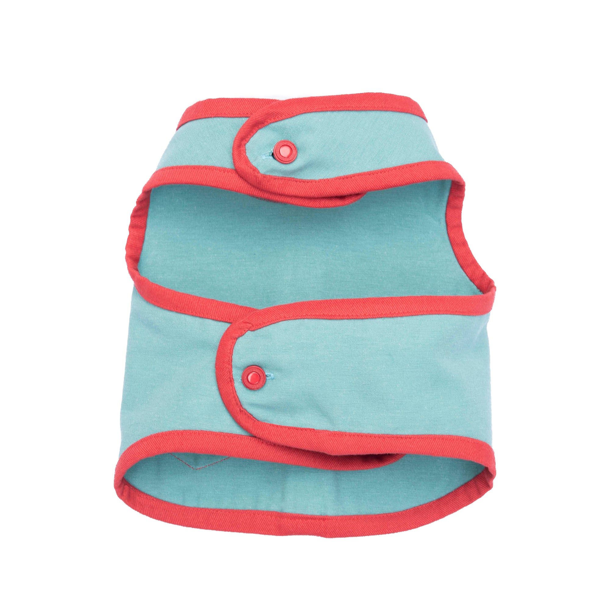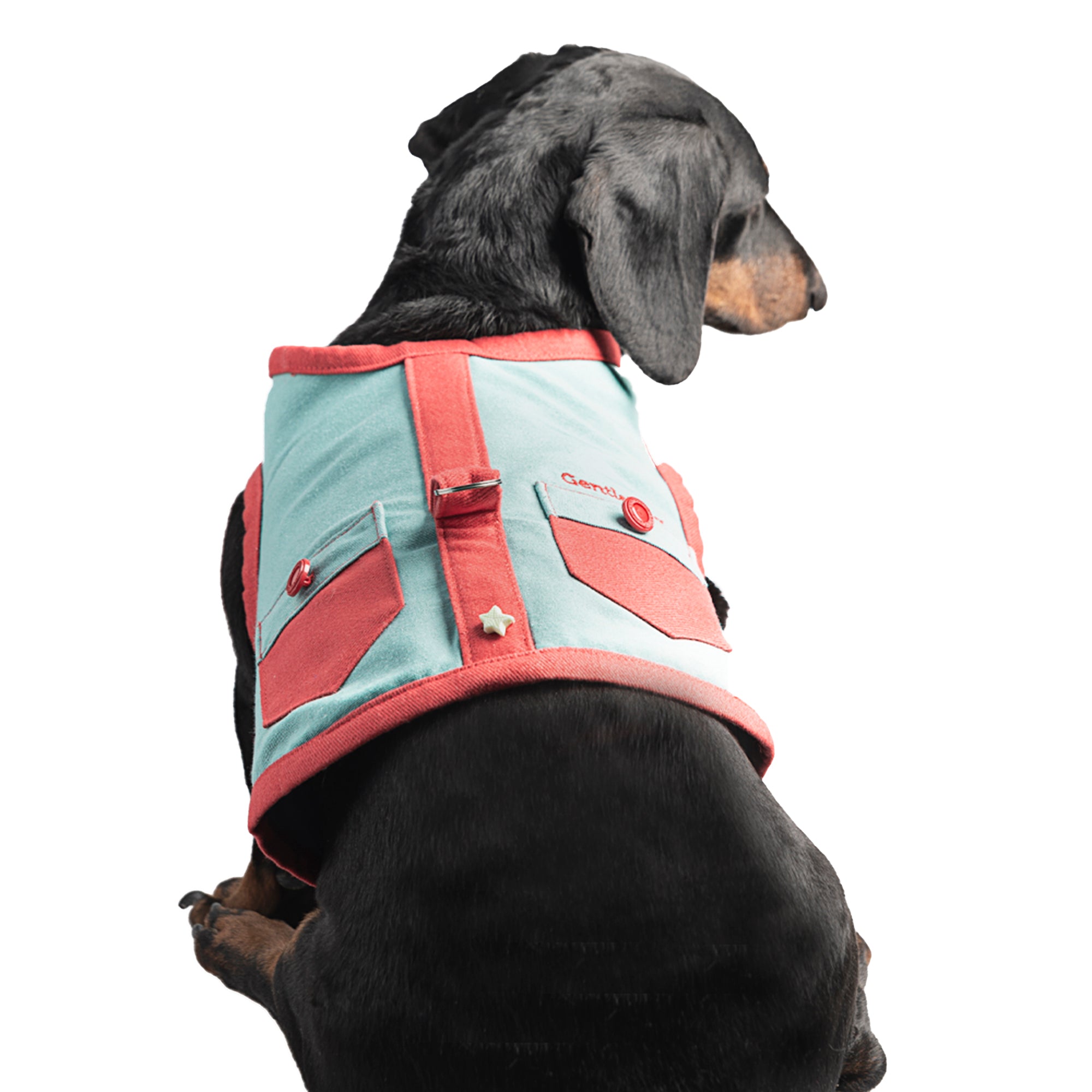 One of the standout features of this harness is the small red pocket with a green flap and contrast stitching. Not only does it add a touch of personality and flair, but it’s also designed to be functional. The pocket is ideal for holding small essentials like waste bags or treats during your outings, keeping everything you need close by. The button closure system is another thoughtfully designed detail, ensuring the harness stays securely in place. With multiple buttonhole options, you can easily adjust the harness to fit your dog’s unique body shape and size for a perfect, snug fit.
