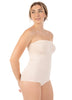 The strapless design offers a sleek and minimalistic look, ideal for wearing under form-fitting tops or dresses. The bodysuit features a thong style bottom with snap closure for convenience and comfort. The seamless construction ensures a smooth and flattering silhouette, while the pale pink color adds a touch of femininity to any outfit.
